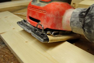 • Step 2: Distress the wood.  First, sand the four edges on the top of each board using a palm sander. Then, hit the wood with a bag of screws. You may want to hit some boards with a hammer as well to create marks and dents.