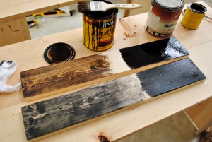 • Step 5: Test boards with inexpensive paint brushes, layering two types of stain. The DIY bloggers of Young House Love chose Ebony and Dark Walnut from Home Depot.