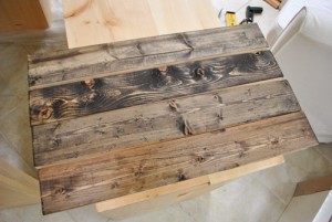 • Step 6: Use your preferred perfect combination on all of the boards. Notice how the distressing shows up more after the stain has been applied. Don’t worry about inconsistencies in color and texture–they add to the authentic look!